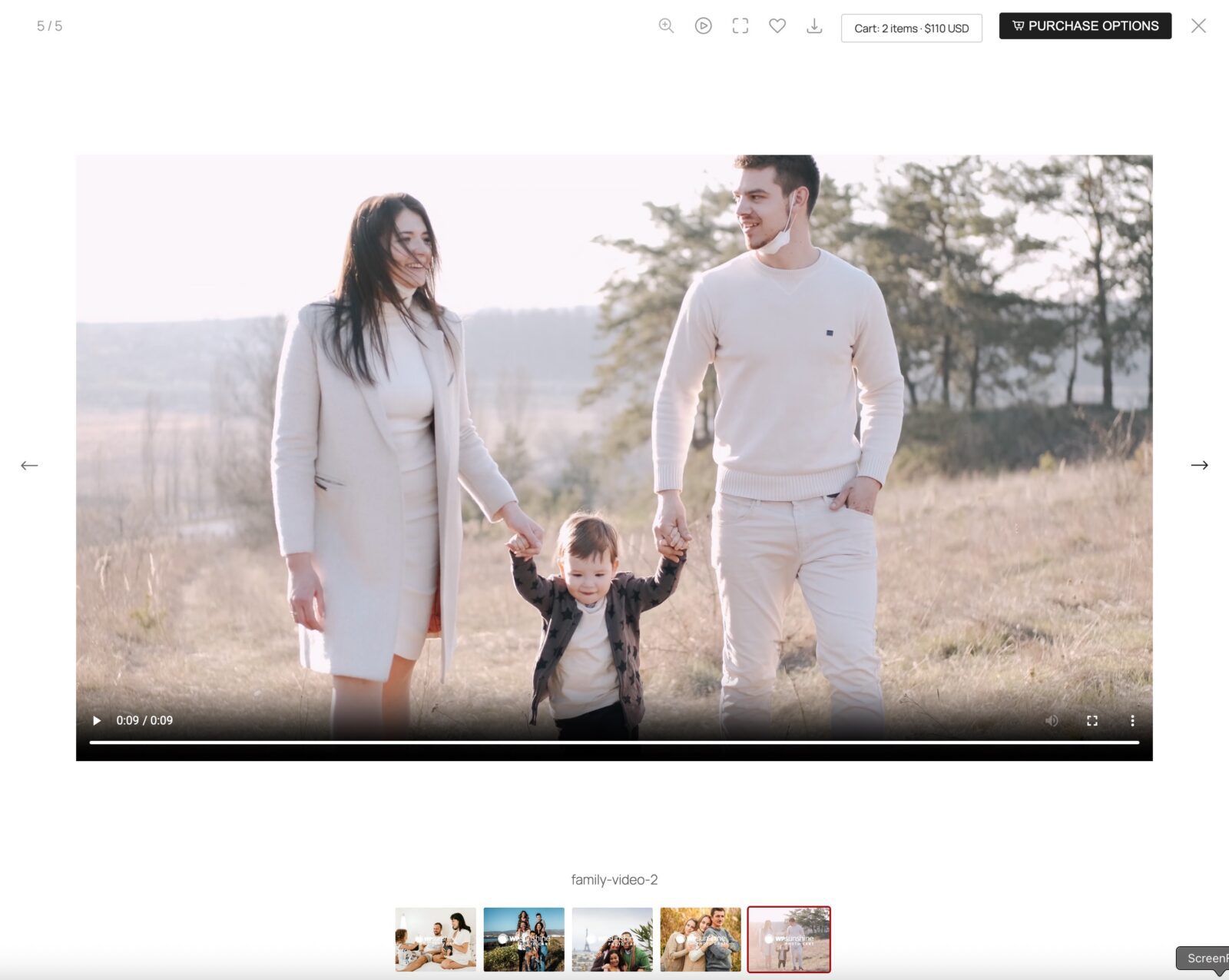 Sell videos alongside photos in your galleries with HTML5 playback, optional preview clips, and automatic download fulfillment.