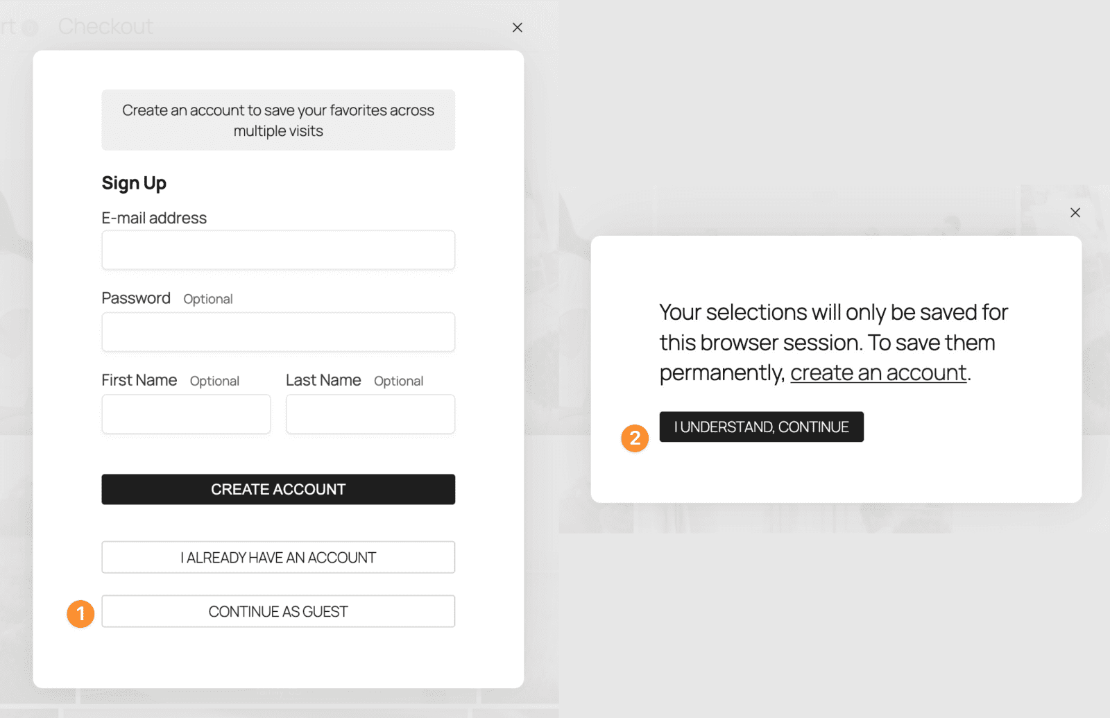 If they choose "Continue as guest," their favorites work just like a logged-in user for that session. They can browse galleries, add favorites, view their Favorites page, and even add favorites to cart.